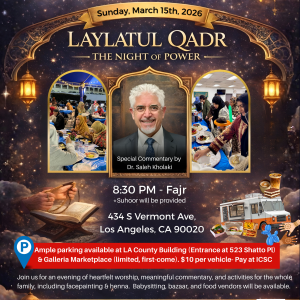 8:30 pm – 10:30 pmLaylatul Qadr at ICSC- The Night of Power Local Date: Mar 15 – 16 2026 | Local Time: 11:30 pm – 1:30 am ICSC-Islamic Center of Southern California