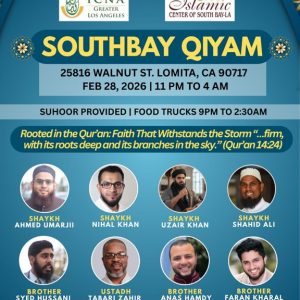 11:00 pm – 4:00 amSouth Bay QiyamExpired Local Date: Mar 02 2026 | Local Time: 2:00 am – 7:00 am ICSB-Islamic Center of South Bay LA