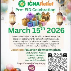 11:00 am – 1:00 pmICNA Relief Pre-Eid CelebrationExpired Local Date: Mar 15 2026 | Local Time: 2:00 pm – 4:00 pm Fullerton Downtown Plaza