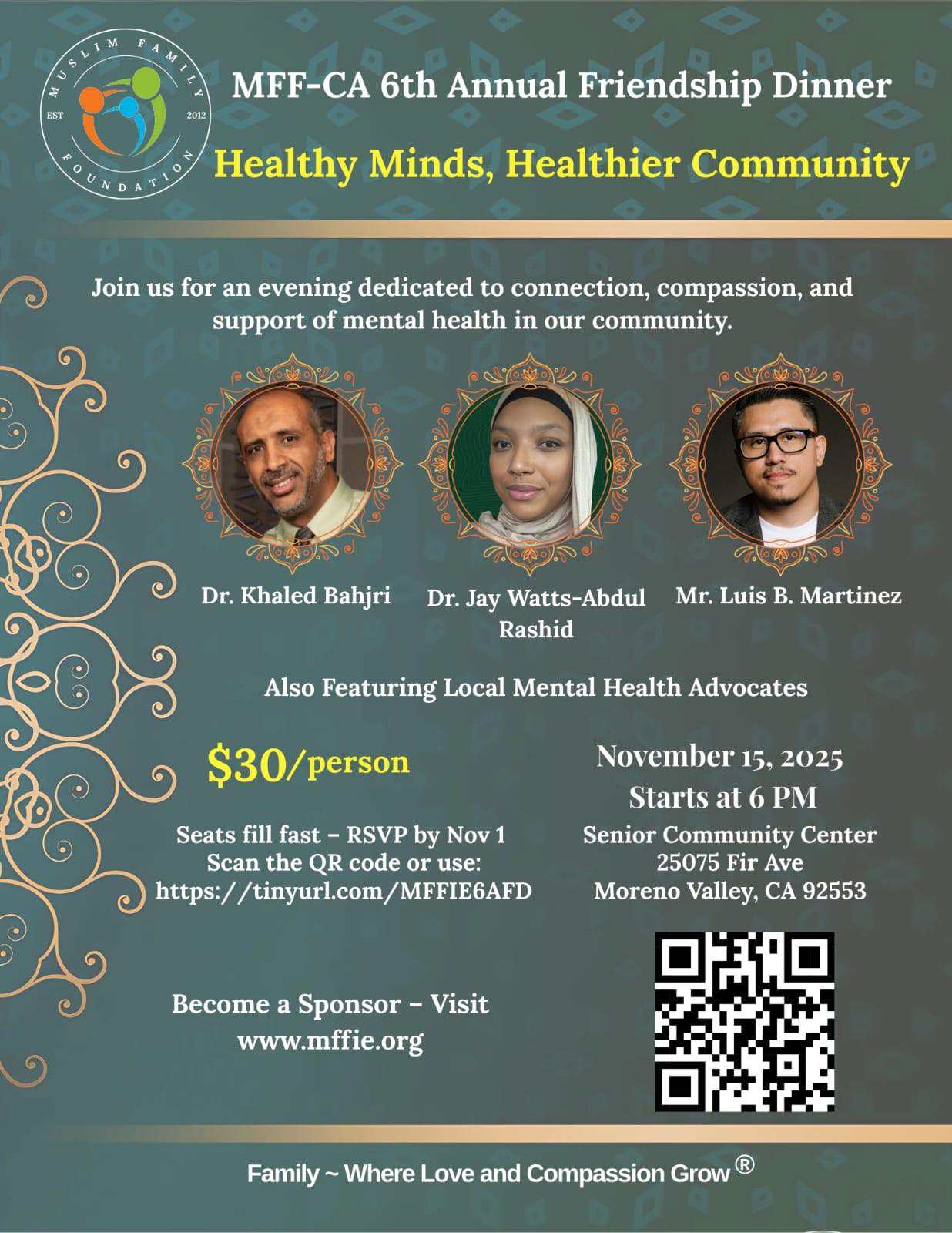 Muslim Family Foundation 6th Annual Friendship Dinner “Healing Minds, Healthier Community” in Moreno Valley. An evening of connection, compassion, and support for mental health in our community. Featuring Dr. Khaled Bahjri, Dr. Jay Watts-Abdul Rashid, Mr. Luis B. Martinez & other local advocates