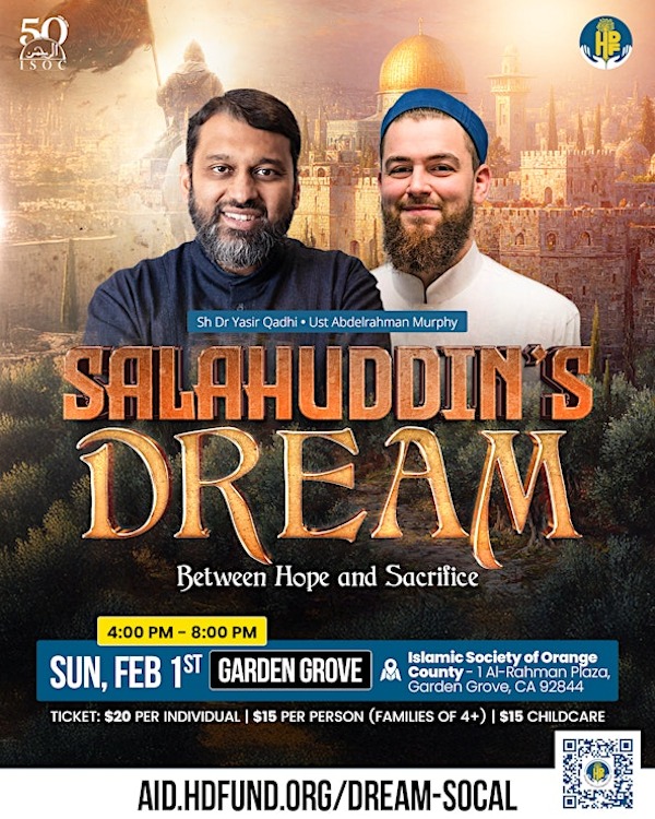 Guided by Shaykh Yasir Qadhi and Ustadh Abdelrahman Murphy, this event will connect the legacy of Salahuddin’s vision with the realities of our modern world. Together, we will reflect on what it means to embody sacrifice and hope in our time both as individuals and as a community.
