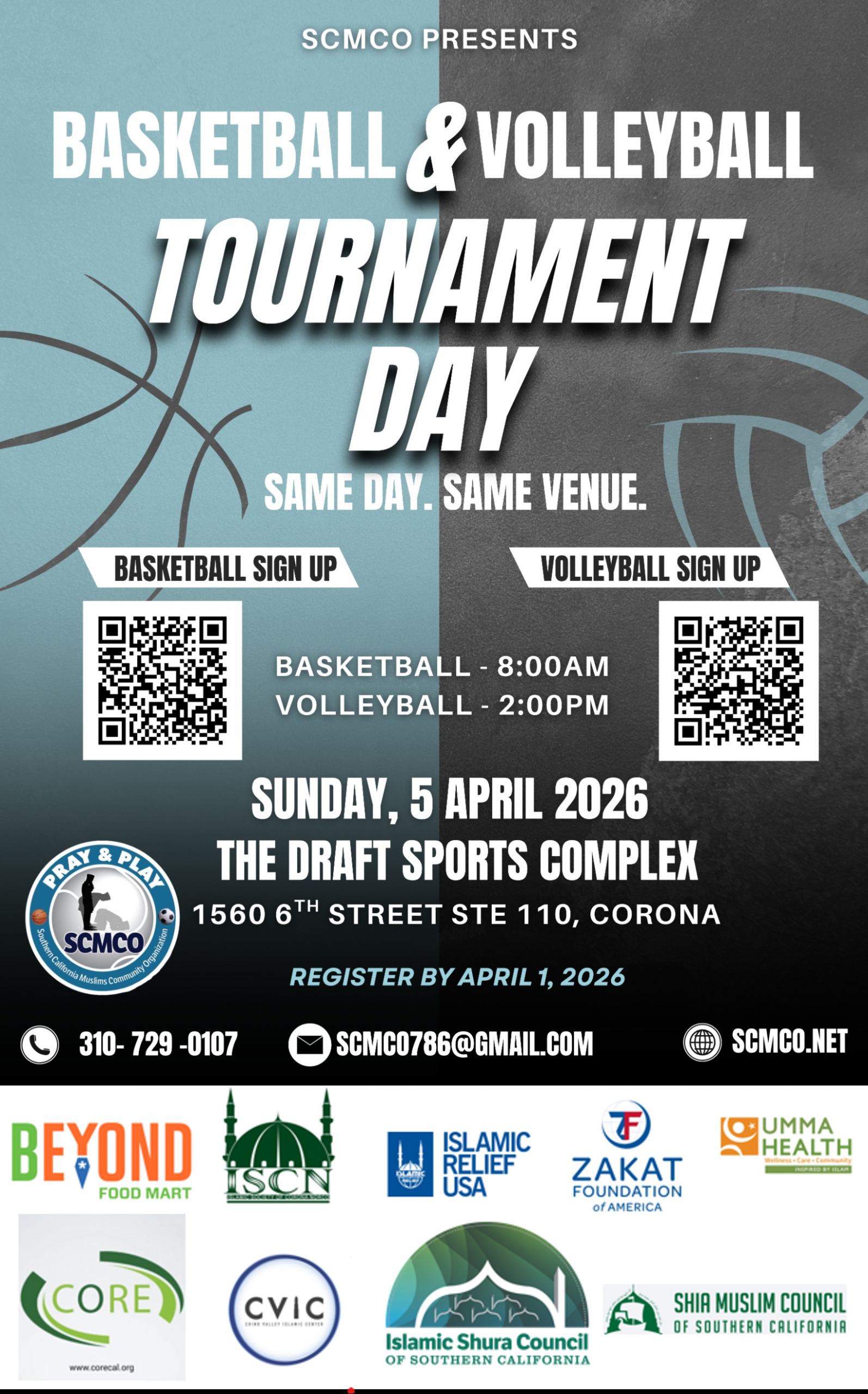 SCMCO Joint Masjid Basketball and Volleyball Tournaments SCMCO is pleased to announce the SCMCO Joint Masjid Basketball & Volleyball Tournament + Add to Google Calendar + iCal / Outlook export The event is finished.