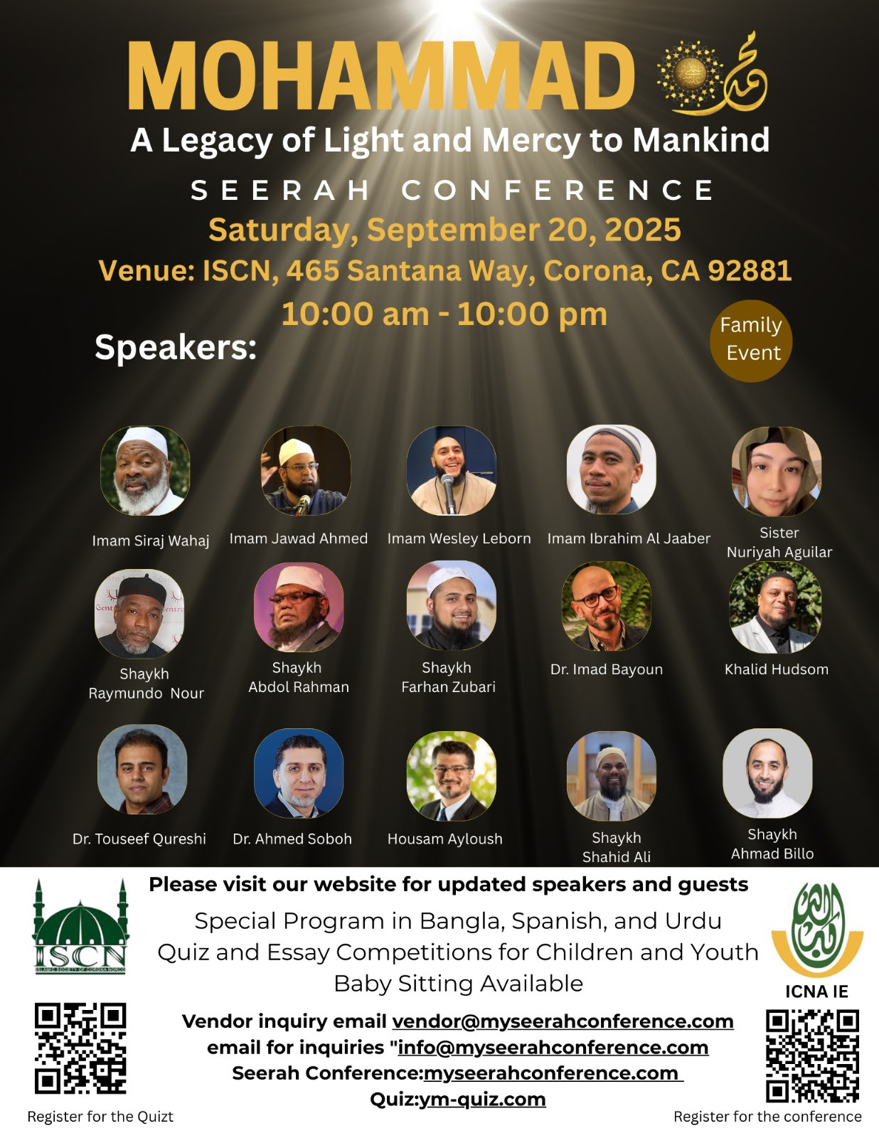 Mohammad: A Legacy of Light and Mercy to Mankind  – Keynote Speaker: Imam Siraj Wahhaj.  Please register as space is limited.  Also, Vendor spots available.