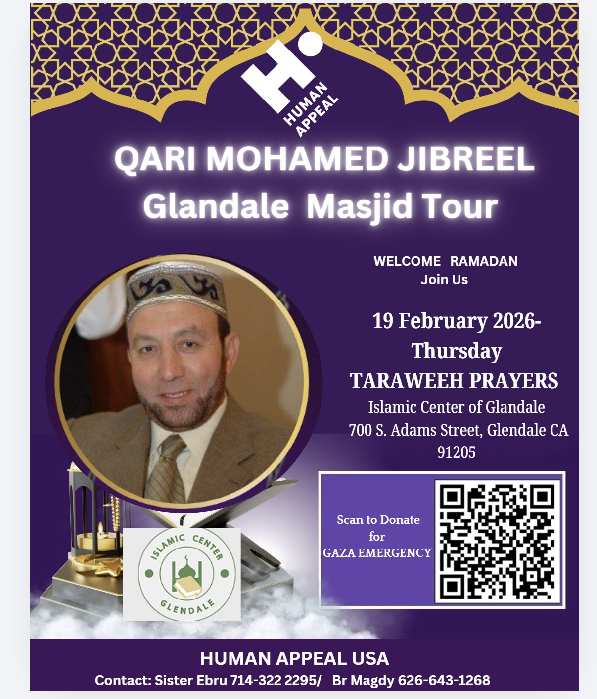 Sh Mohamed Jibreel Glendale Masjid Taraweeh Tour Taraweeh night with famous Qari Mohamed JIBREEL and Gaza appeal + Add to Google Calendar + iCal / Outlook export The event is finished.
