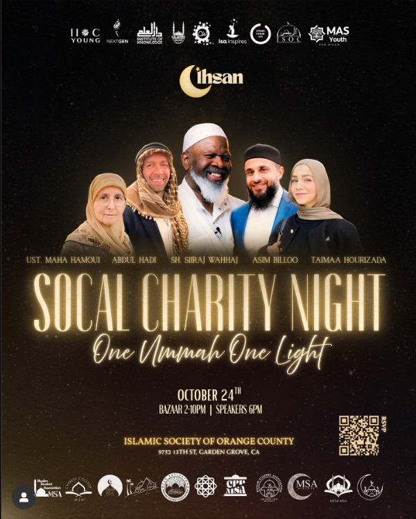Main event and the lectures start at 6pm, featuring Sheikh Siraj Wahhaj, Ustadha Maha Hamoui, Br. Asim Billoo, Br. Abdul hadi, and Taimaa Hourizada.
