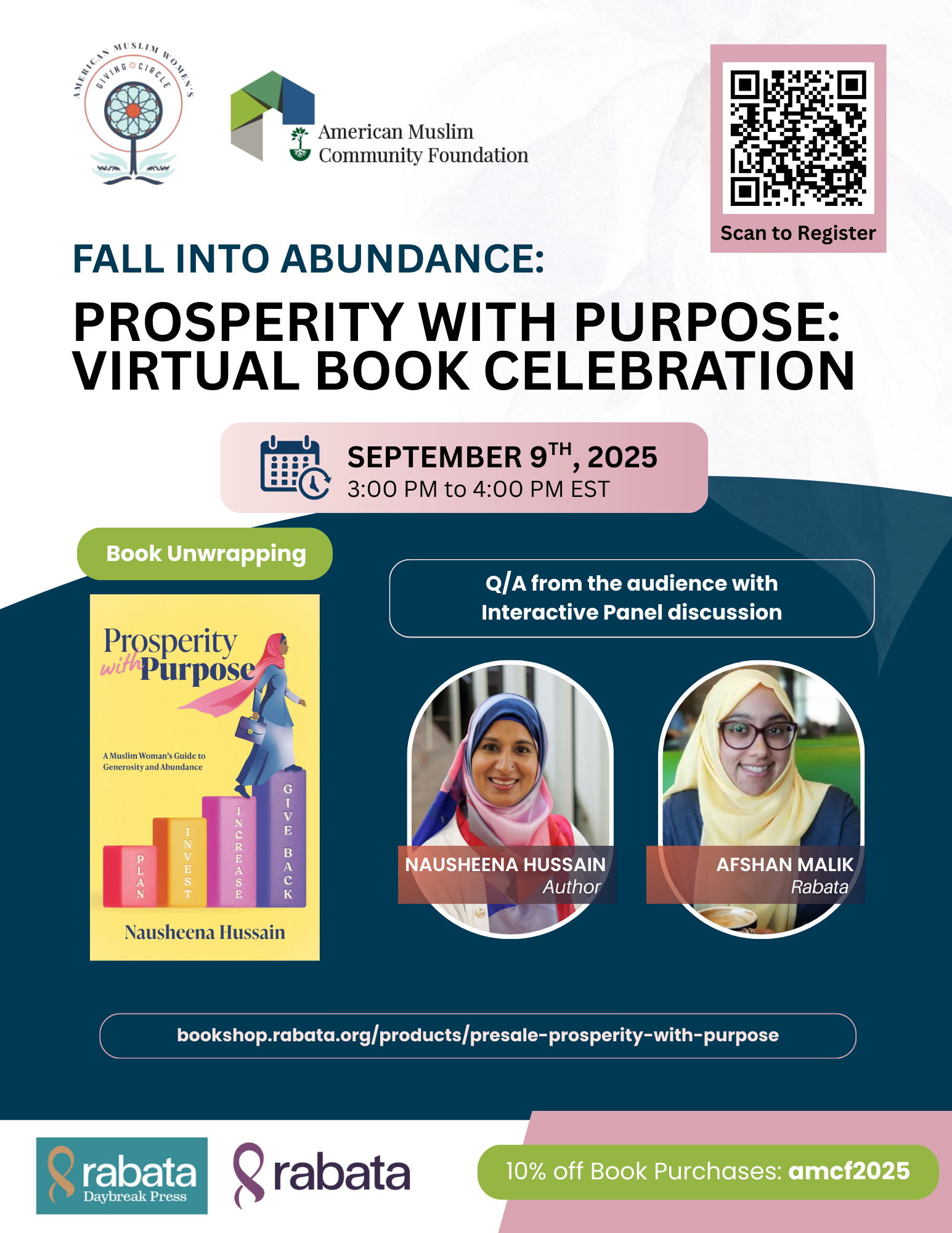 Join AMCF on Tuesday, September 9, 2025, at 4 PM ET | 1 PM PT for a special virtual celebration of Prosperity with Purpose, the new book by Nausheena Hussain, AMCF Board Member and co-founder of the Muslim Women’s Giving Circle. Discover insights on philanthropy, faith, and collective giving, and take part in an inspiring conversation with the author.